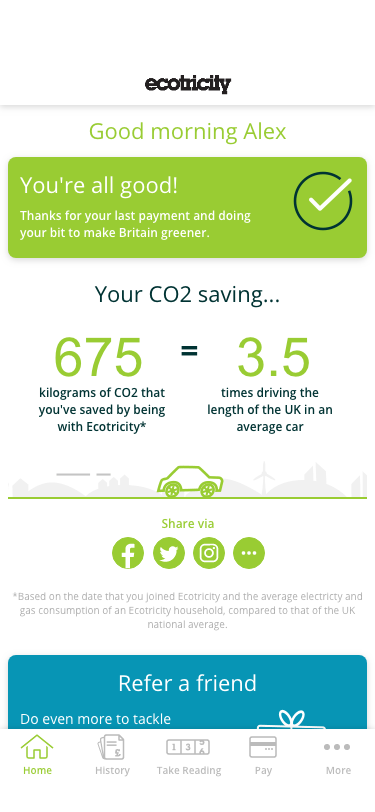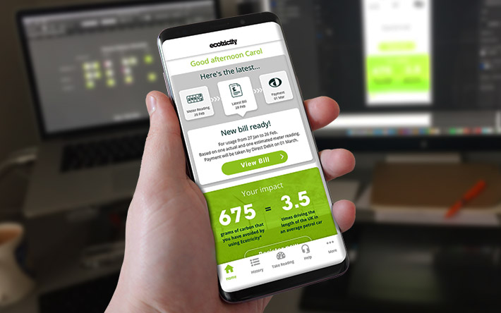 Ecotricity is a green energy provider built on the principle of heavily reinvesting its profit in to building more green energy infrastructure (e.g. windmills, sunmills) and creating a sustainable future. I was approached by Ecotricity to work with their in-house team to completely redesign their customer facing mobile app for iOS and Android.