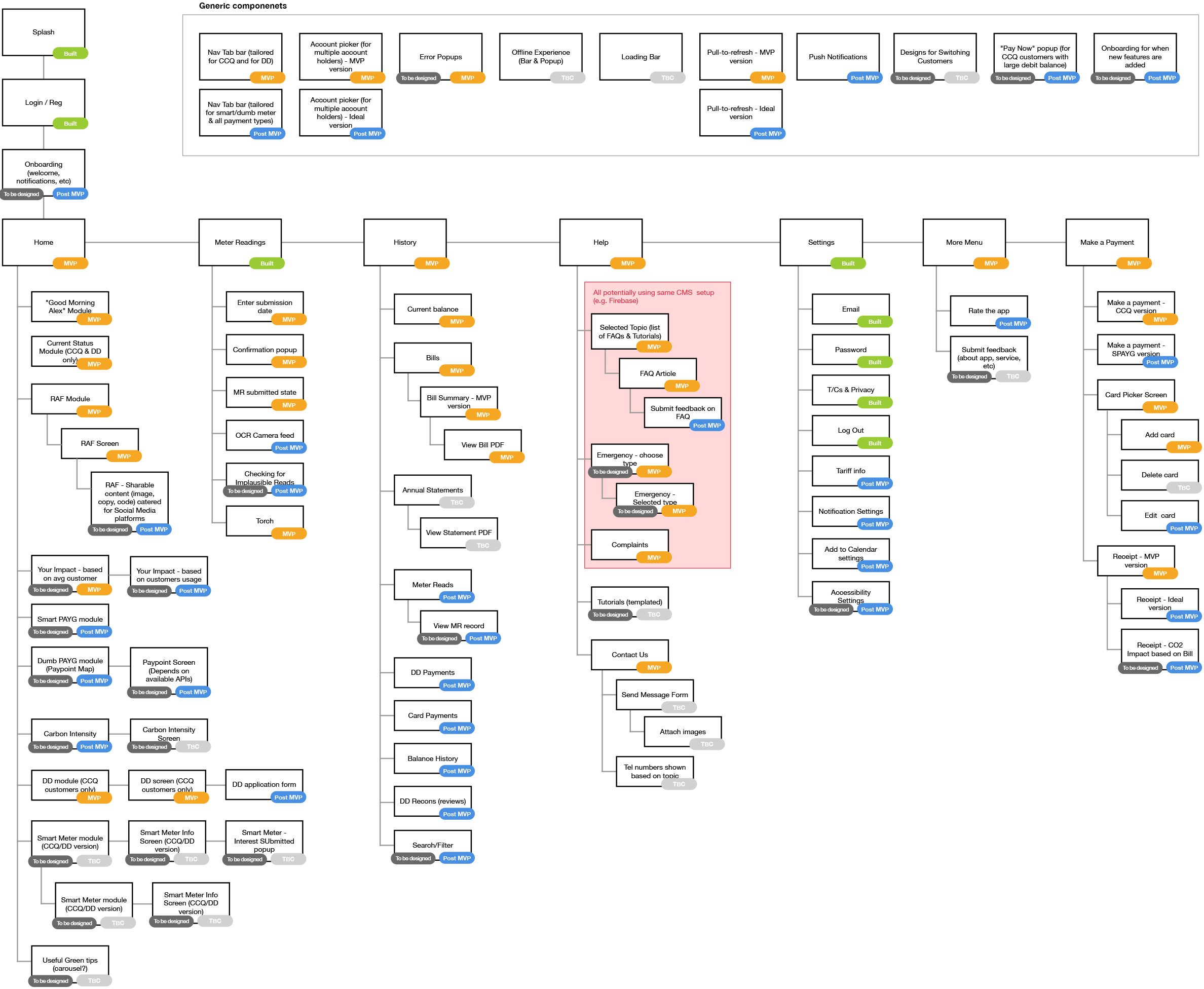I worked out the sitemap for the new app and consulted with numerous stakeholders and the developer team to establish what should be included for MVP and what would be for post launch. The sitemap also included common components (e.g. popups) and details on dependencies, etc.