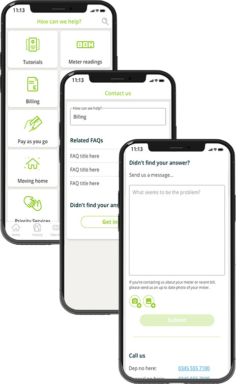 1. self-help depending on what area of the app they are in (e.g. if they wish to query a bill based on an estimated meter reading, then push them to submit a reading), else…